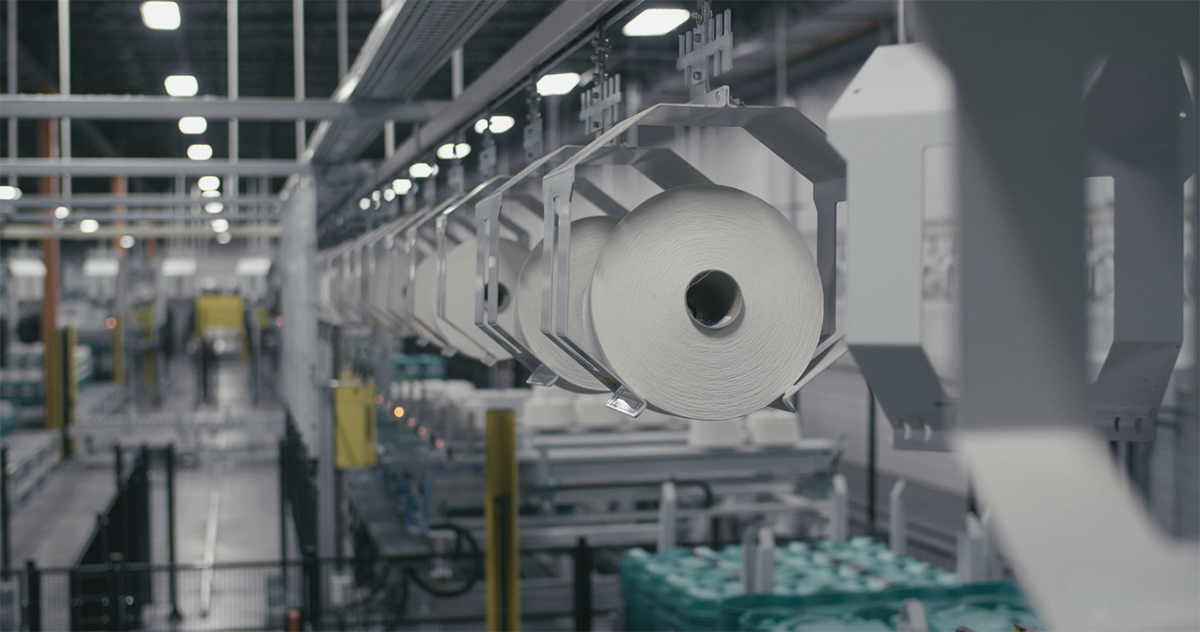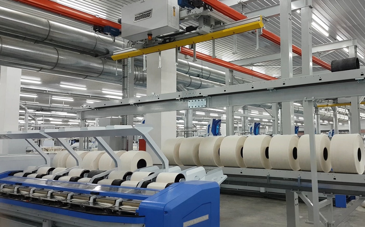 與環錠紡絡筒機,氣流紡機,渦流紡機無縫對接,藉由頂部輸送軌道將需要包裝的筒紗輸送到指定的包裝區域,可以是同一樓層或不同樓層,甚至搬運至單獨的包裝倉庫。