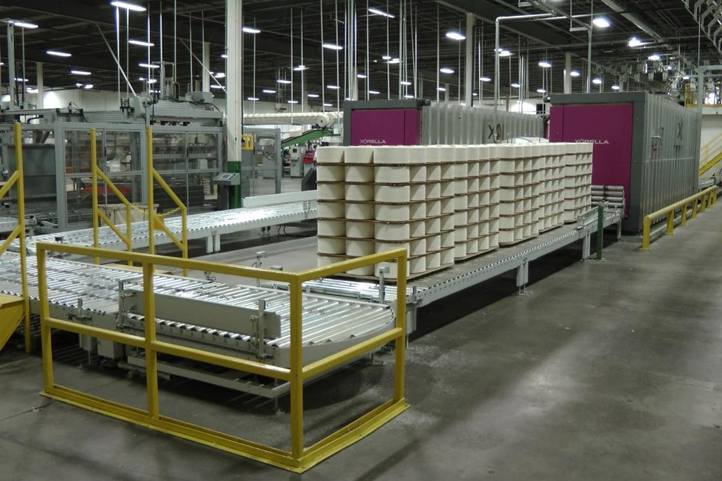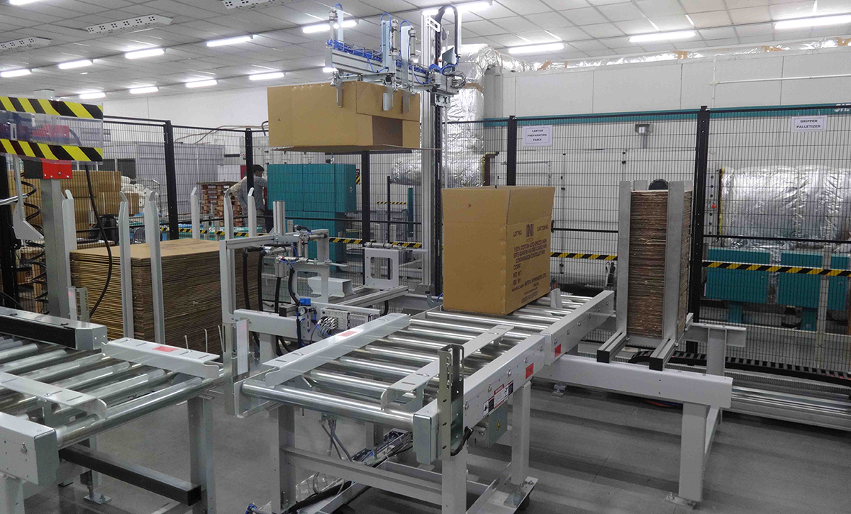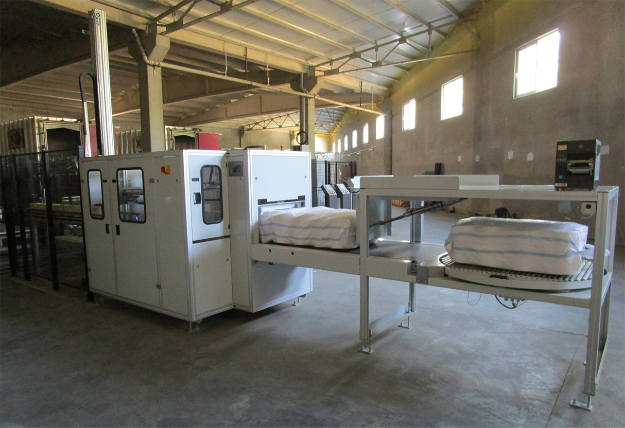 實現筒紗定重包裝,自動套袋,自動入箱、封箱并貼標簽,以及滿箱自動堆垛功能。